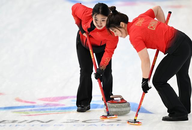 2月13日,中国队选手董子皆(右)、姜嘉怡在比赛中擦冰。 新华社记者 赵子硕 摄