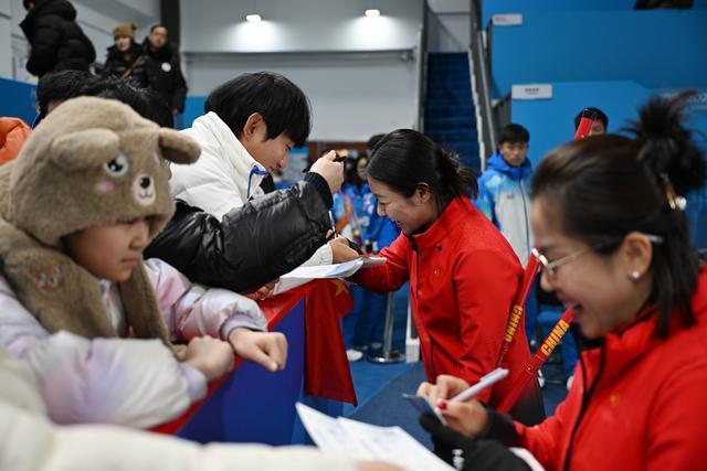2月13日,中国队选手韩雨(右二)、王芮(右一)在比赛后给不雅众签名。 新华社记者 赵子硕 摄