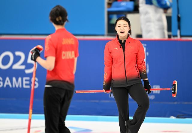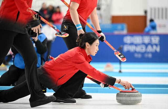 2月13日,中国队选手姜嘉怡在比赛中掷壶。 新华社记者 赵子硕 摄