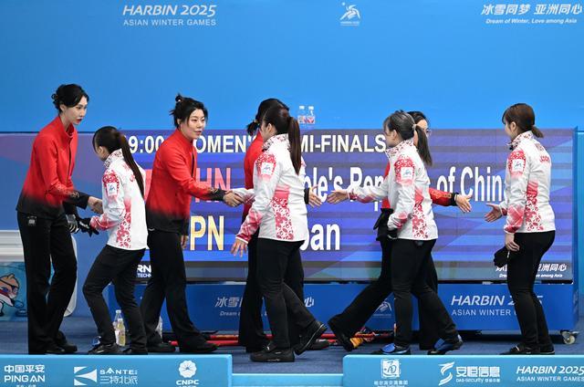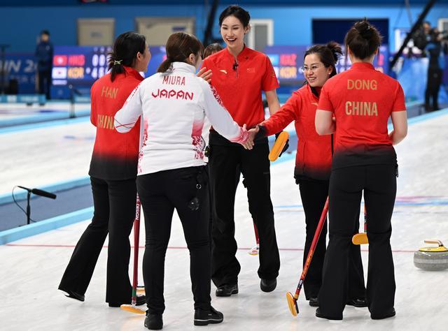 2月13日,中国队选手王芮(右二)在比赛后和日本队选手三浦由唯菜捏手。 新华社记者 赵子硕 摄