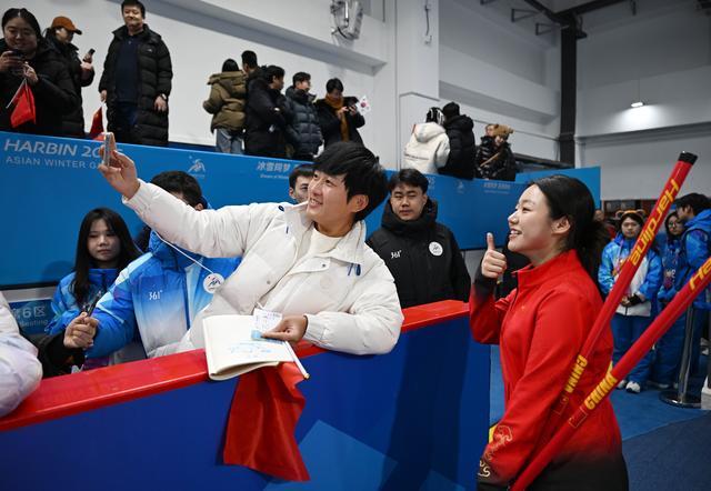 2月13日,中国队选手韩雨(右)在比赛后和不雅众合影。 新华社记者 赵子硕 摄