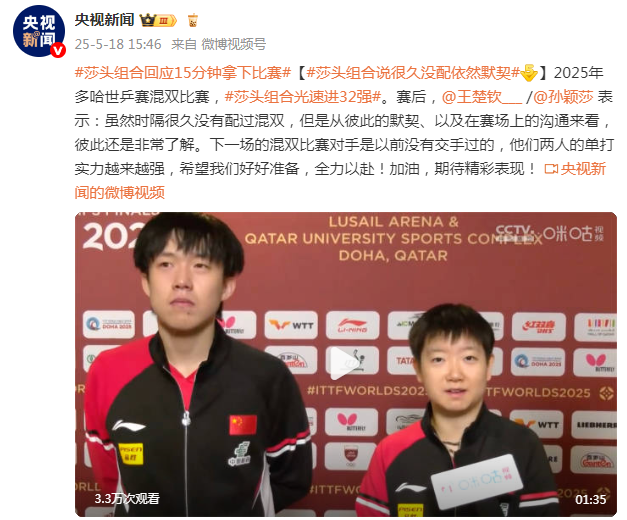 2025年多哈世乒赛混双比赛,“莎头组合”光速进32强。赛后,王楚钦 /孙颖莎 默示:诚然时隔很久莫得配过混双,然而从互相的通晓、以及在赛场上的相通来看,互相还黑白常了解。下一场的混双比赛敌手所夙昔莫得交手过的,他们两东说念主的单打实力越来越强,但愿咱们好好准备,任重道远!加油,期待精彩推崇!