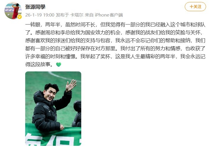 张源社媒写说念:“一行眼,两年半,诚然时辰不长,但我认为有一部分的我依然融入这个城市和球队了。感谢周总额李总给我为国安遵循的契机,感谢我的战友们给我的笑容与缓和,感谢心爱我的球迷们给我的维持与包容,我恒久不会健忘你们的匡助和接收,咱们皆有一部分的我方被好好保存在对方那处。