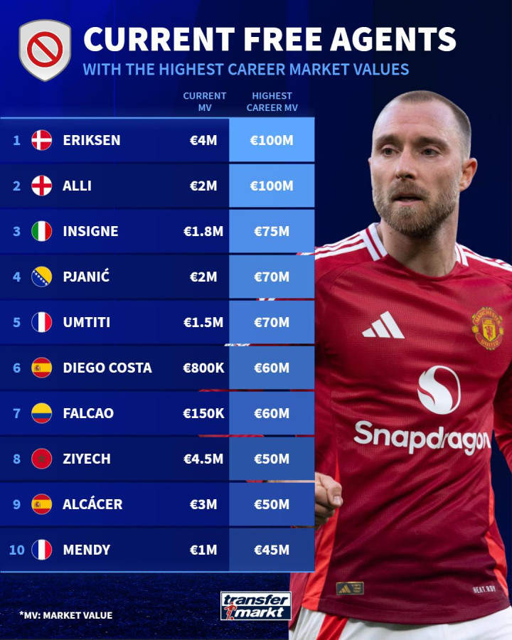 虎扑09月06日讯德转本日统计了刻下解放球员历史身价榜,其中埃里克森与阿里以1亿欧并排榜首。