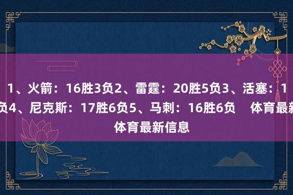 1、火箭:16胜3负2、雷霆:20胜5负3、活塞:19胜5负4、尼克斯:17胜6负5、马刺:16胜6负 体育最新信息
