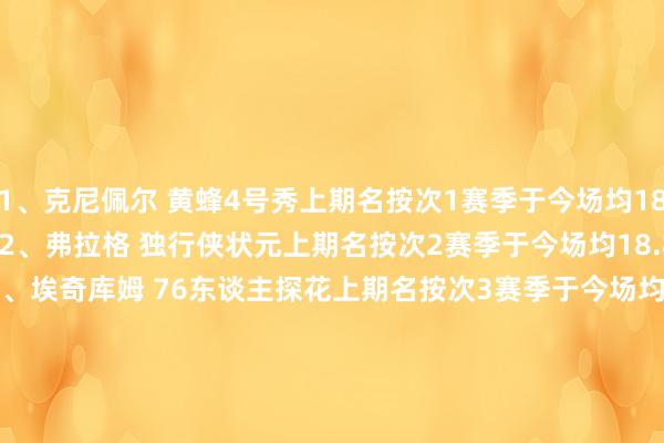 1、克尼佩尔 黄蜂4号秀上期名按次1赛季于今场均18.7分5.5篮板3.6助攻2、弗拉格 独行侠状元上期名按次2赛季于今场均18.8分6.4篮板4.1助攻3、埃奇库姆 76东谈主探花上期名按次3赛季于